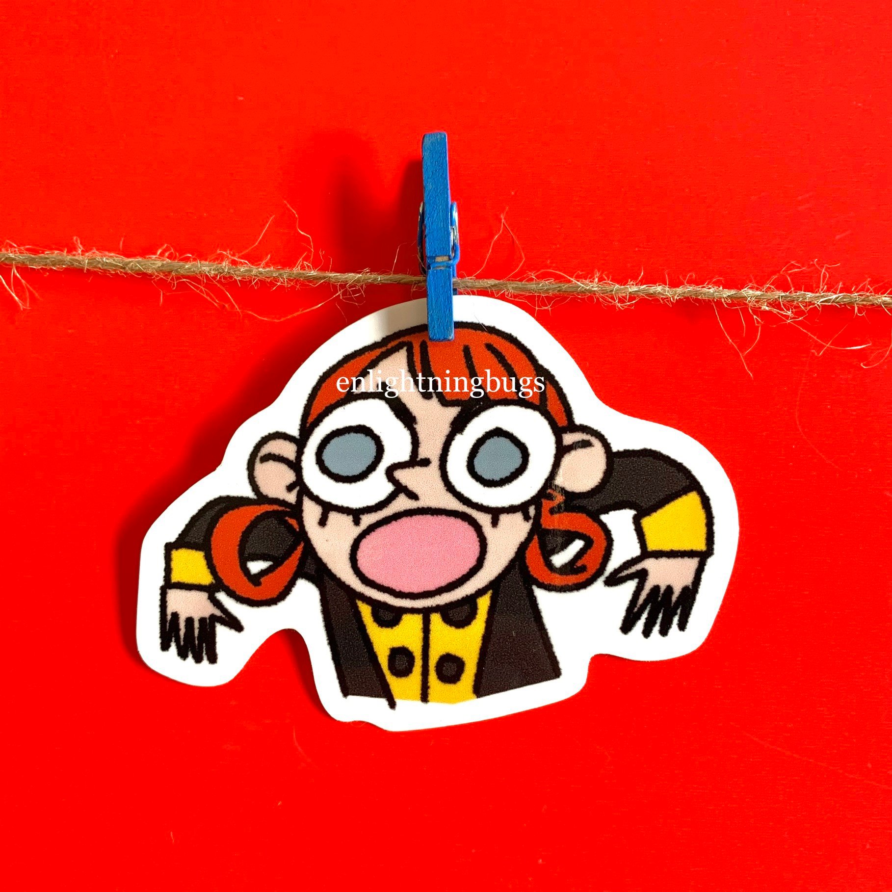 Display your shock with this 3x2inch glossy vinyl die cut Annette sticker. As seen on tv* *in a comic on twitter
